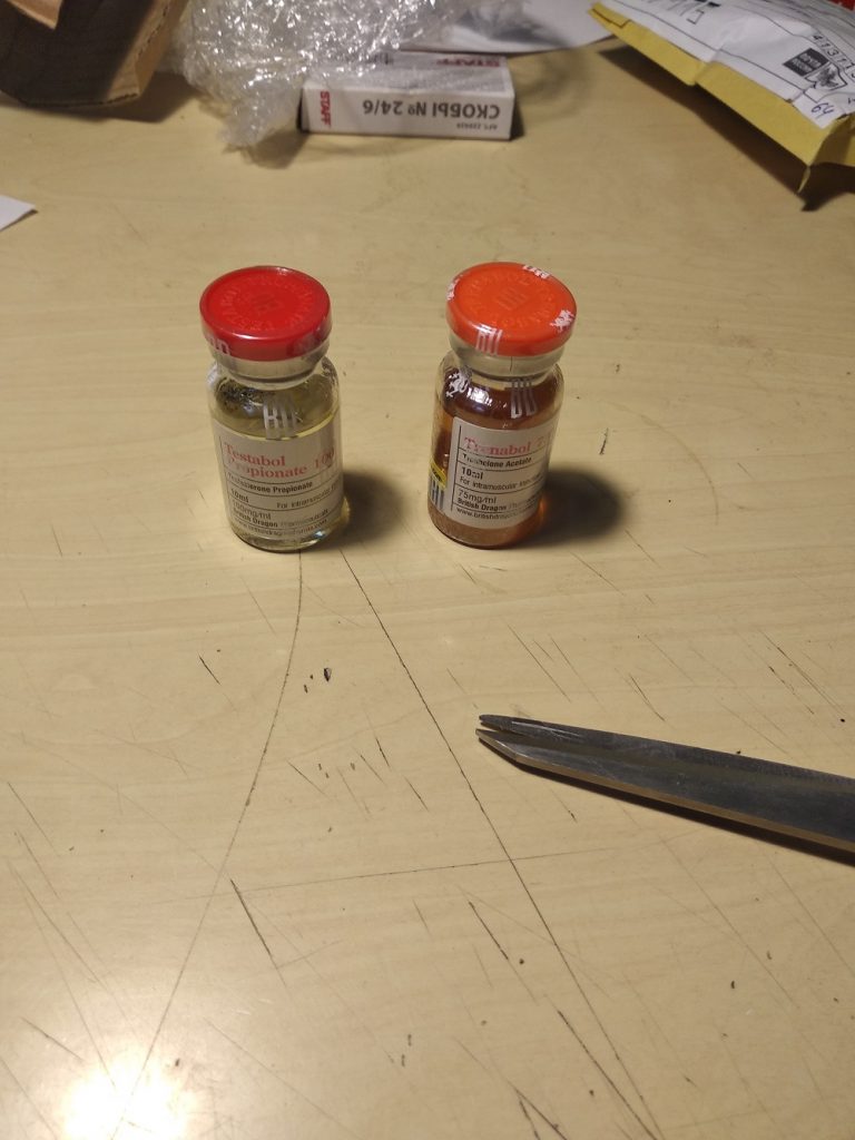 Поставил сегодня по кубу каждого препа. Набиралось легко, зашло тоже без проблем. Посмотрим как дальше будет бедро себя чувствовать. Думаю инжектов через 5-6 сдам тест и эстро. Крышки к стати разные тоже на виалах. Мне больше по душе та, которая остаётся на ножке. Резинки очень мягкие, не сильно думаю иглу тупят при наборе.